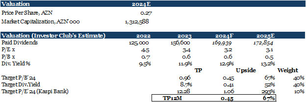 İnvestor Klub-un ABB səhmləri üçün hədəf qiyməti hər səhmə 0,45 AZN olaraq müəyyənləşib. Bu da 67% potensial artım təklif edir. Bu hədəfin üç üsulla əldə ediləcəyi gözlənilir: hədəf P/B nisbəti; 2024-cü il üçün dividend gəliri; əlavə olaraq, 10%ehtimalla ən yaxşı ssenari kimi Kaspi Bankın (Kz) 2024-cü il üçün güman edilən P/E nisbətinə əsasən səhmləri 1,06 AZN dəyərində proqnozlaşdırırıq.