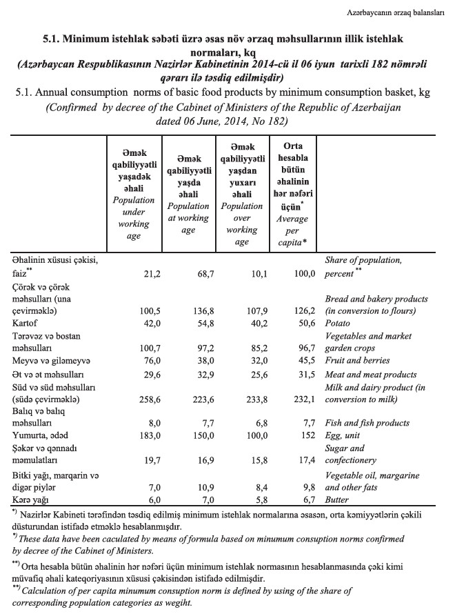 Məcmuədə adambaşına ərzaq məhsullarının istehlakı barədə məlumatlar da yer alıb. Belə ki, Azərbaycanda adambaşına pomidor, üzüm, qoz, fındıq, ət və ət məhsulları, balıq və balıq məhsulları, yumurta istehlakı artıb.