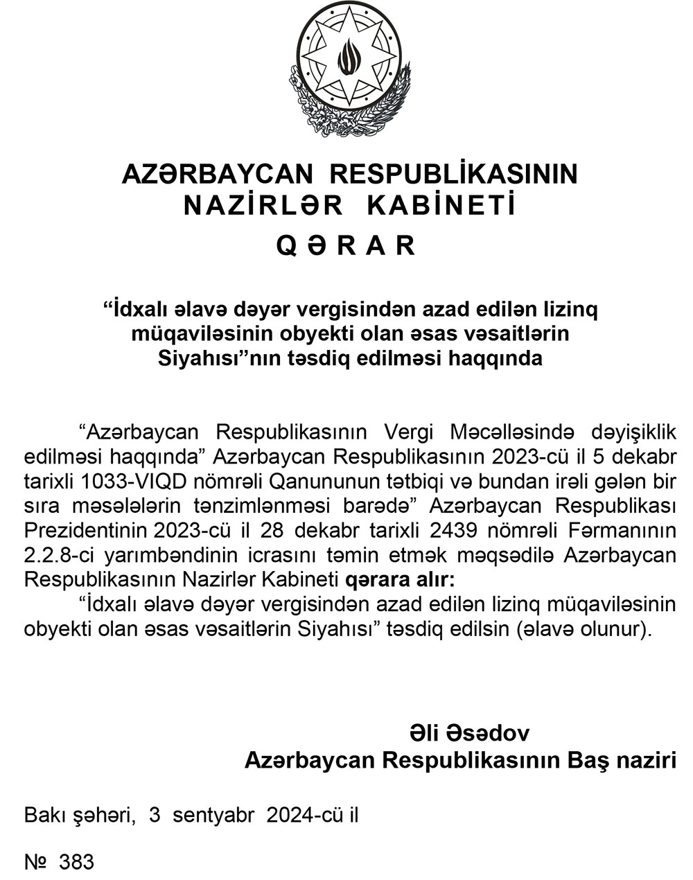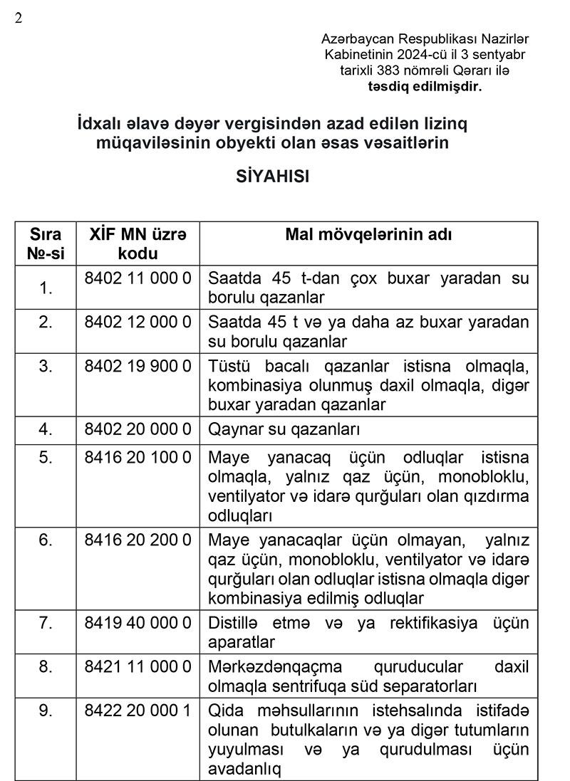 Nazirlər Kabineti “İdxalı əlavə dəyər vergisindən azad edilən lizinq müqaviləsinin obyekti olan əsas vəsaitlərin Siyahısı”nın təsdiq edilib.