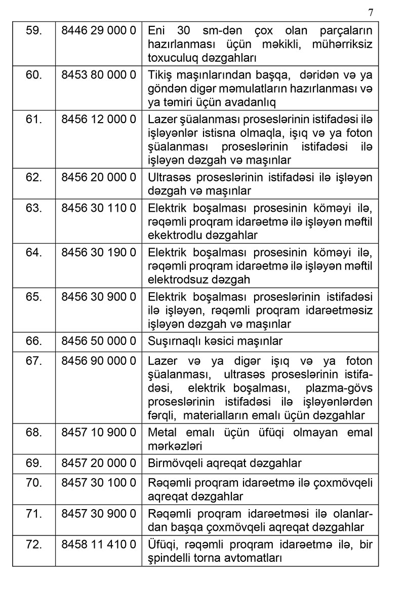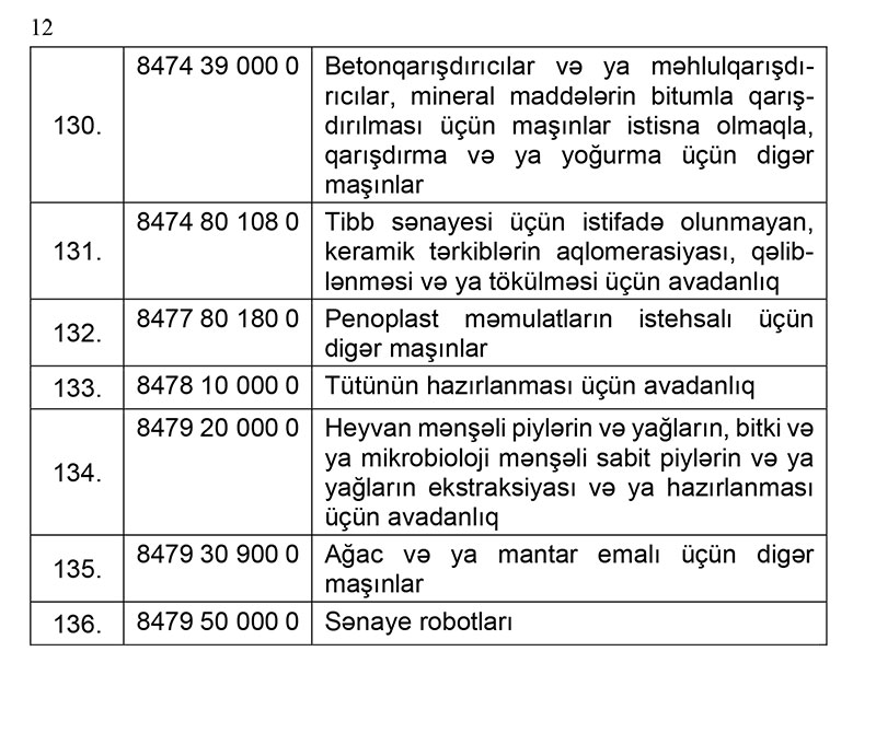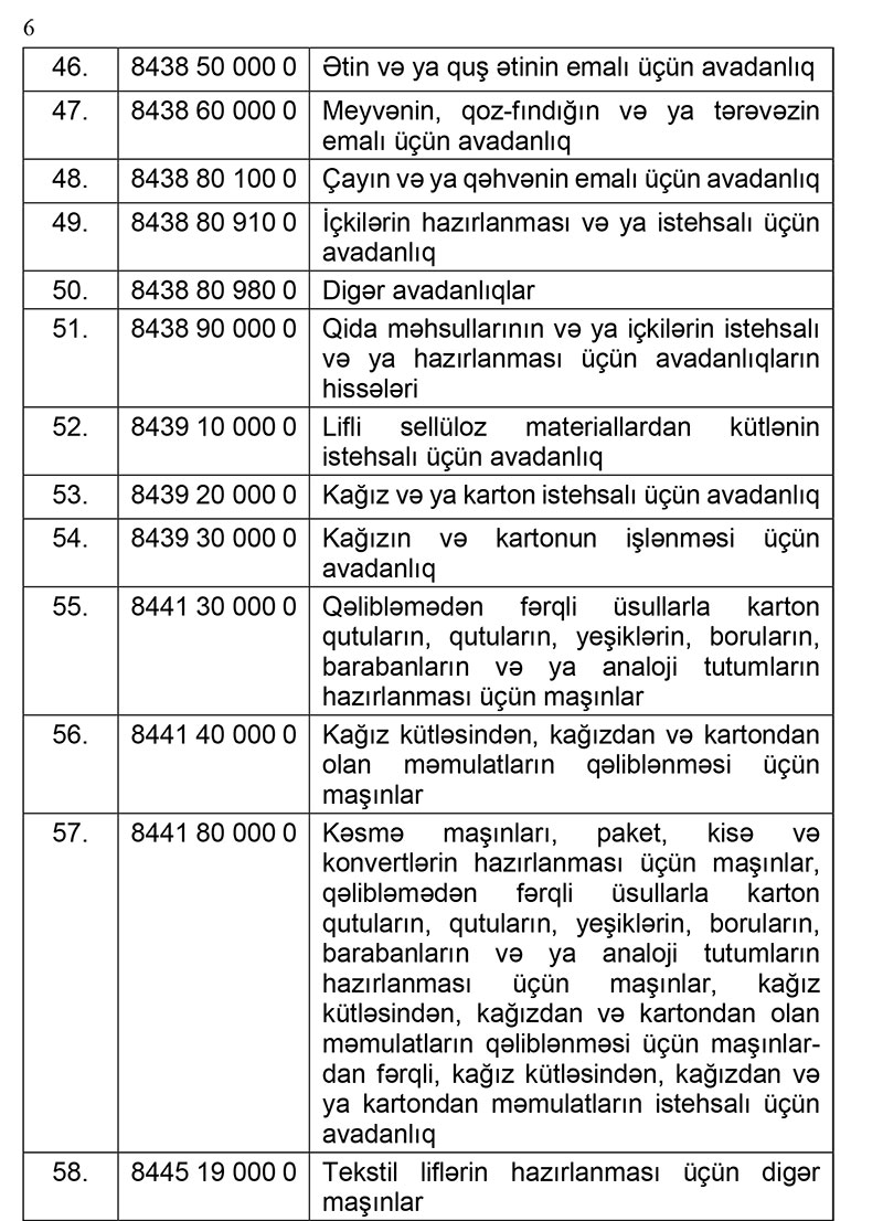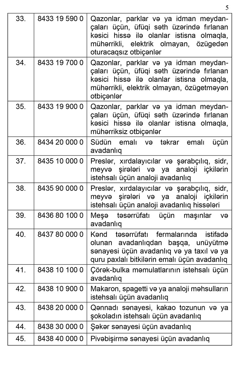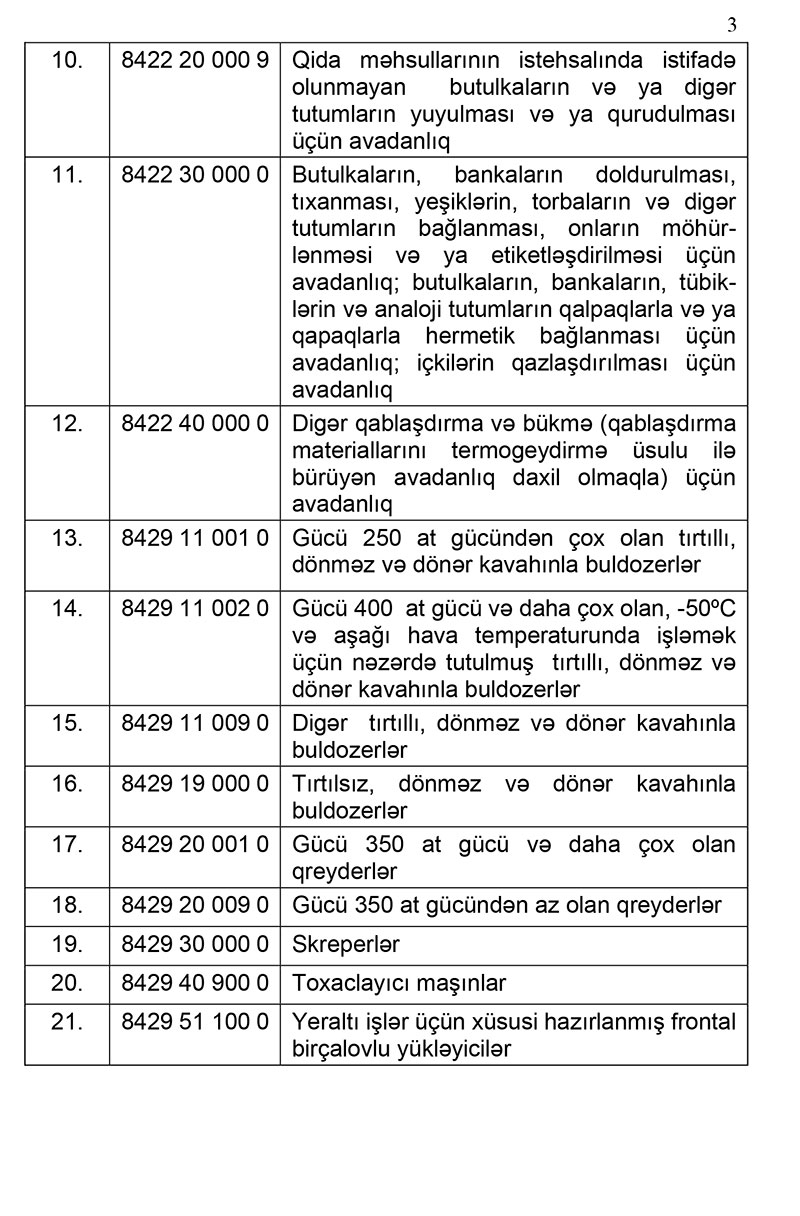 Qərara əsasən, siyahıya 136 lizinq müqaviləsinin obyekti olan əsas vəsaitin idxalı əlavə dəyər vergisindən azad edilib.