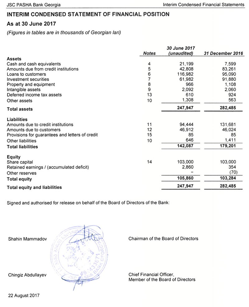 30 İyun 2017-ci il tarixində “PAŞA Bank Gürcüstan” 247 milyon 947 min lari cəmi aktivlərə, 142 milyon 87 min lari cəmi öhdəliklərə və 105 milyon 806 min lari cəmi kapitala malik olub. Bank ötən ilin sonunda 282 milyon 485 min lari cəmi aktivlərə, 179 milyon 201 min lari cəmi öhdəliklərə və 103 milyon 284 min lari cəmi kapitala malik idi.