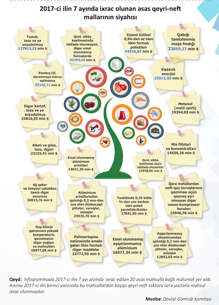 Azərbaycan Respublikası Dövlət Gömrük Komitəsinin məlumatına əsasən, 2017-ci ilin 7 ayı ərzində qeyri-neft sektoru üzrə 855 milyon ABŞ dolları dəyərində mal ixrac olub. "Marja"nın məlumatına görə, bu rəqəmi aylıq idxal ilə müqayisə etdikdə hələ də Azərbaycanın qeyri-neft ixracının nə qədər az olduğu aydın görünür.