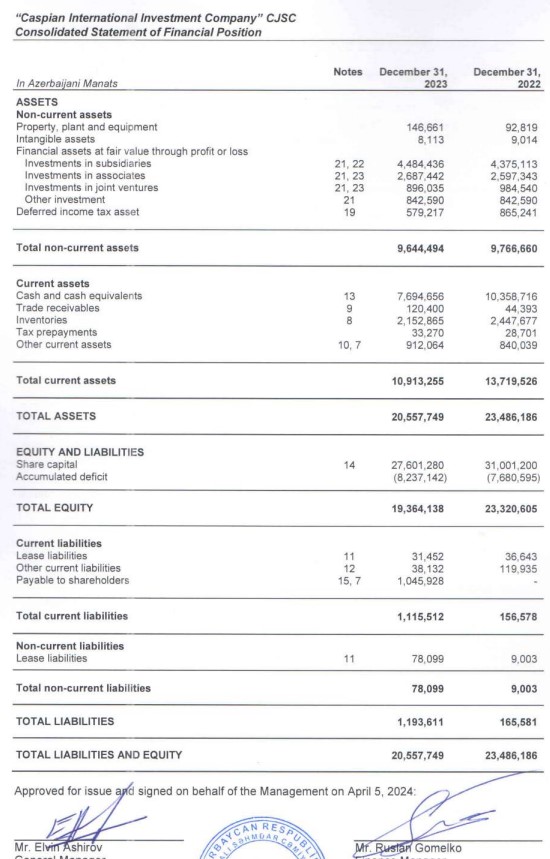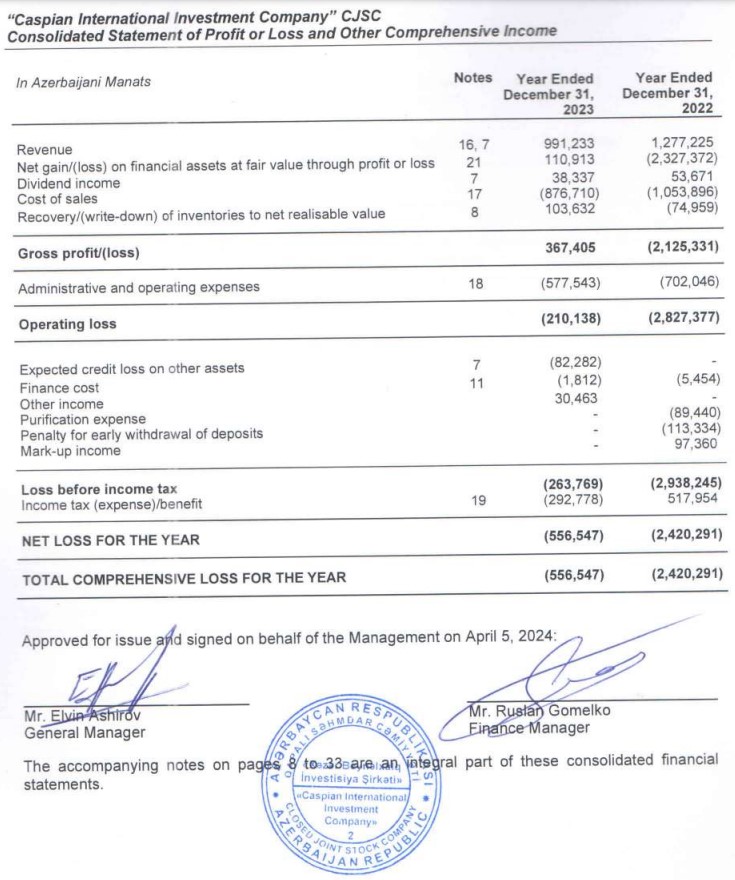 “Xəzər Beynəlxalq İnvestisiya Şirkəti” QSC (Caspian International Investment Company) 2023-cü ili 557 min manat xalis zərər ilə başa vurub. Şirkət 2022-ci ili 2 milyon 420 min manat xalis zərər ilə bağlamışdı. Beləliklə, ötən il “Xəzər Beynəlxalq İnvestisiya Şirkəti”nin xalis zərəri 4,3 dəfə azalıb. Zərərin azalamsı aktivlərin dəyərizləşməsi üzrə itkinin olmaması ilə bağlıdır. Həmçinin şirkətin satış və inzibati xərclərində də azalma baş verib.