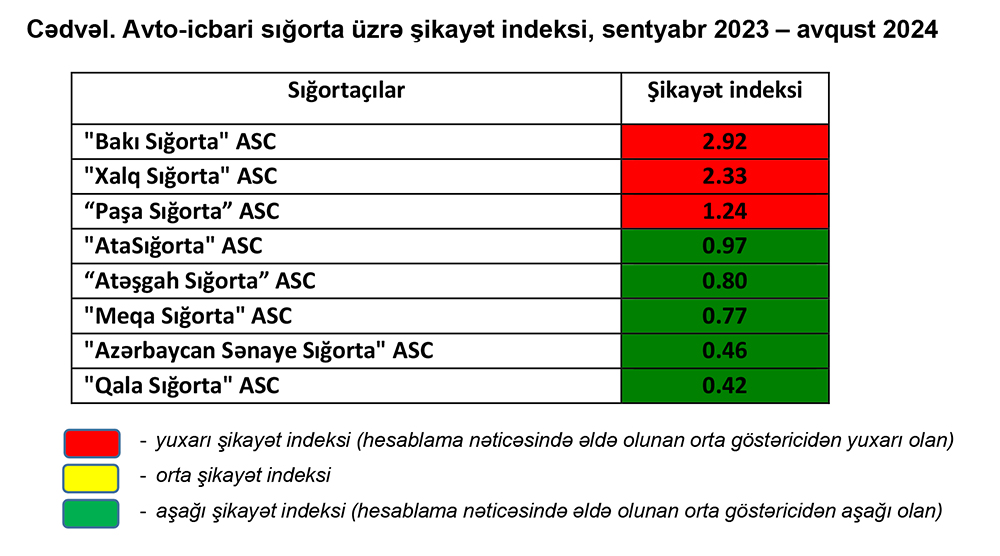 Belə ki, qırmızı ona olaraq qəbul edilən yuxarı şikayət indeksində (hesablama nəticəsində əldə olunan orta göstəricidən yuxarı olan) "Bakı Sığorta", "Xalq Sığorta" "PAŞA Sığorta", yaşıl zona olaraq qəbul edilən aşağı şikayət indeksində (hesablama nəticəsində əldə olunan orta göstəricidən aşağı olan) isə "AtaSığorta", “Atəşgah Sığorta”, "Meqa Sığorta", "Azərbaycan Sənaye Sığorta" və "Qala Sığorta" yer tutub. Sarı zona olaraq qəbul edilən orta şikayət indeksində yer tutan şirkət yoxdur.