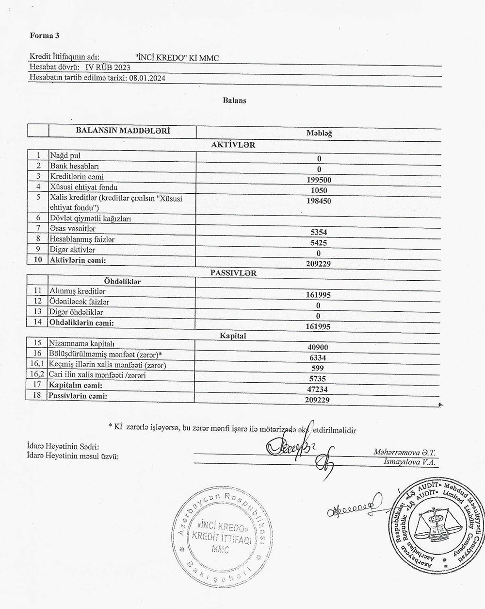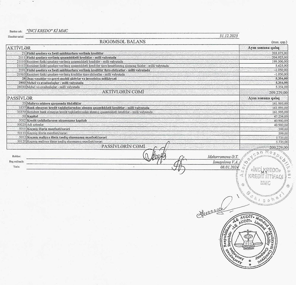 “İnci Kredo Kredit İttifaqı” MMC-nin 31 dekabr 2023-cü il tarixində başa çatan il üzrə maliyyə hesabatları.