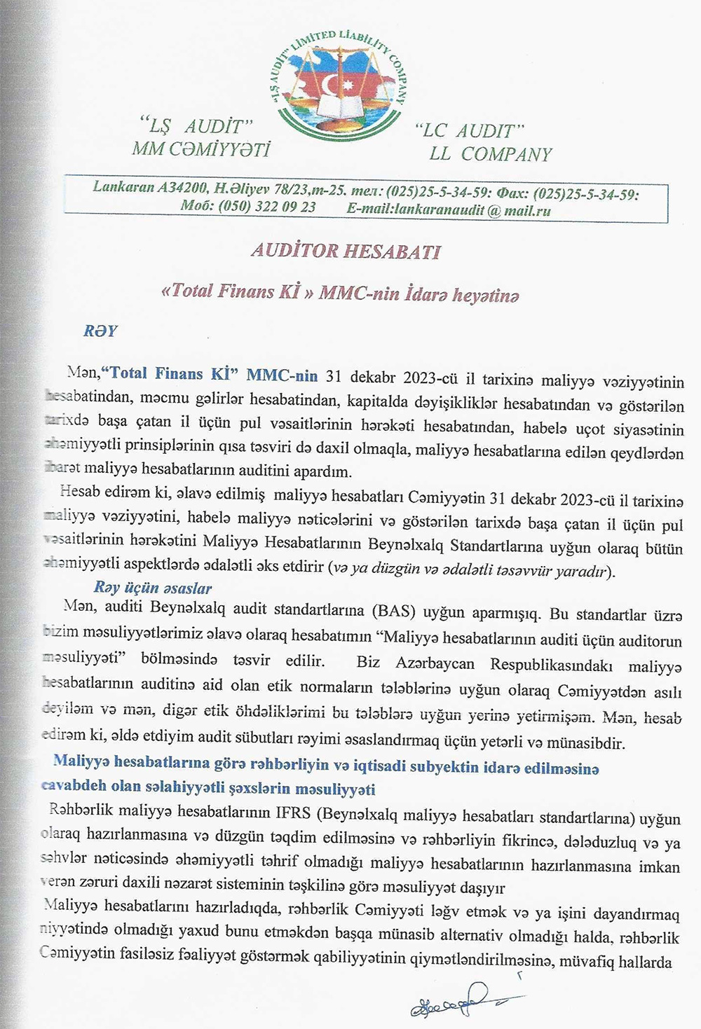 "Total Finans Kredit İttifaqı" MMC-nin 31 dekabr 2023-cü il tarixində bitən il üzrə maliyyər hesabatları