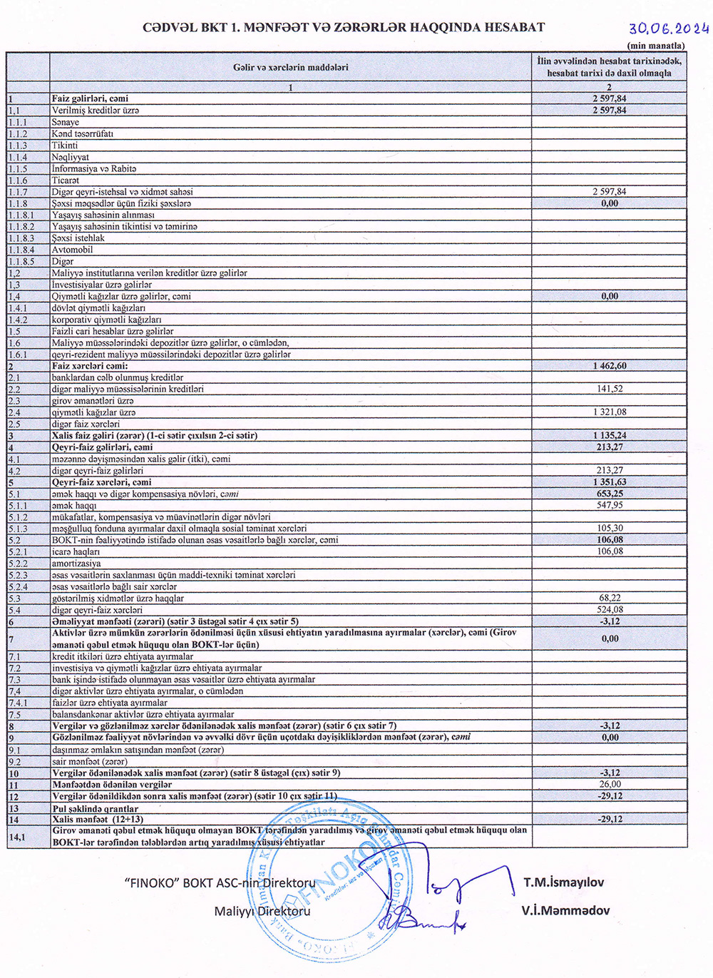 "FİNOKO" Bank Olmayan Kredit təşkilatı Açıq Səhmdar Cəmiyyəti (FİNOKO BOKT) 2024-cü ilin birinci yarısını (yanvar-iyun) 29 min manat xalis zərər ilə başa vurub. Təşkilat 2023-cü ilin eyni dövrünü 65 min manat xalis mənfəət ilə bağlamışdı.