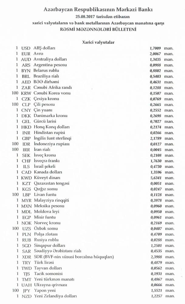 Avqustun 25-nə Mərkəzi Bankın açıqladığı rəsmi Dollar/manat məzənnəsi Avqustun 24-ü ilə müqayisədə dəyişməyərək 1,7009 manat olub, Avro/manat məzənnəsi isə 2.0067 manata düşüb.