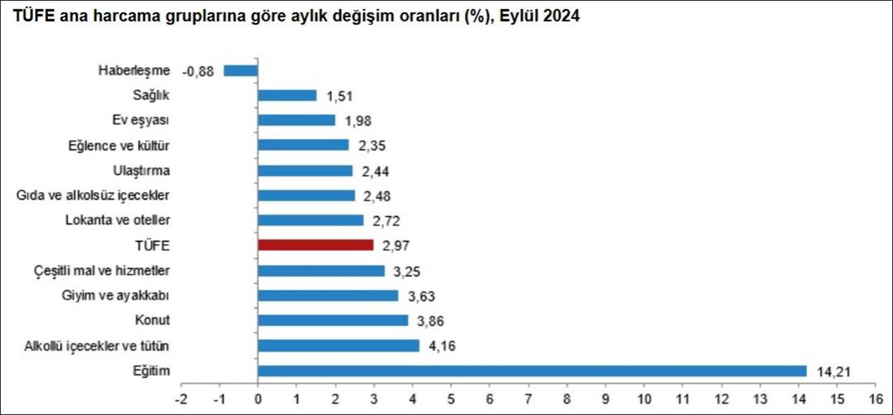 Türkiyədə illik müqayisədə ən böyük qiymət artımı 97,87 faiz ilə mənzildə olub. Təhsil sahəsində 93,59 faiz, restoran və otellərdə 65,41 faiz, spirtli içkilər və tütündə 52,35 faiz, səhiyyədə 50,70 faiz, müxtəlif mal və xidmətlərdə 46,69 faiz, əyləncə və mədəniyyətdə 43,96 faiz, qida və alkoqolsuz içkilərdə 43,7, geyim və ayaqqabıda 30,70 faiz, qiymət artımı qeydə alınıb.