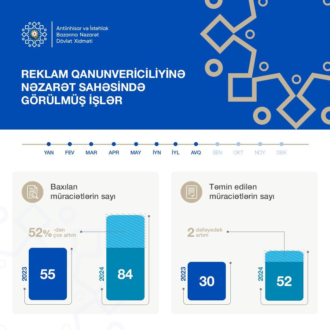 Bu ilin yanvar-avqust aylarında İqtisadiyyat Nazirliyi yanında Antiinhisar və İstehlak Bazarına Nəzarət Dövlət Xidməti reklam qanunvericiliyinin pozulması ilə bağlı 84 müraciətə baxıb ki, bu da ötən ilin eyni dövrü ilə müqayisədə 52 % çoxdur.