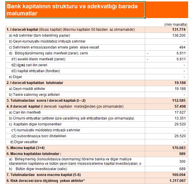 Dövr ərzində Bankın kapital mövqeyi də xeyli güclənib. Məcmu kapital ötən ilin 3-cü rübü ilə müqayisədə 11 %-dən çox artaraq, 169 milyon manat olub. 2024-cü ilin ilk doqquz ayında Bank kapital adekvatlığını yüksəldib. Belə ki, ilin üçüncü rübünün sonuna bankın kapital adekvatlıq əmsalı artaraq, 12,9 %-ə yaxınlaşıb. Hesabat dövrünün sonuna bankın aktivləri də 12% artaraq, 1 milyard 716 milyon manat olub.