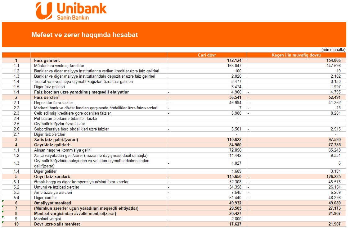 2024-cü ilin 9 ayı üzrə Unibankın xalis mənfəəti 17,6 milyon manat təşkil edib.Unibank 2024-cü ilin 3-cü rübü ərzində də aktiv kreditləşməni həyata keçirərək, ölkə iqtisadiyyatına öz töhfəsini verməkdə davam edib.