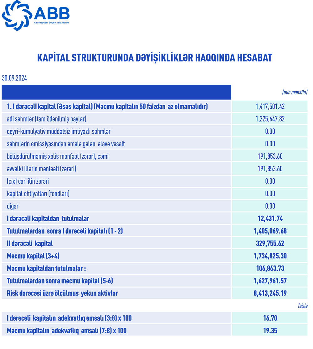 30 sentyabr 2024-cü il tarixində "ABB" ASC 1 milyard 627 milyon 961 min manat məcmu kapitala malik olub. III-cü rüb sonunda ABB-nin I dərəcəli kapitalının adekvatlıq əmsalı 16.70%, məcmu kapitalının adekvatlıq əmsalı isə 19.35% təşkil edib. Bu göstəricilər tənzimləyici orqanın müəyyən etdiyi normalardan (müvafiq olaraq sistem əhəmiyyətli banklar üçün minimum 6% və 12%) əhəmiyyətli şəkildə yüksəkdir.