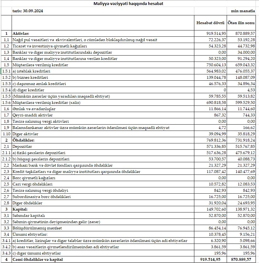 2024-cü ilin 9 ayında "Bank of Baku"nun cəmi aktivləri isə 48 milyon 625 min manat və ya 5,6% artaraq 919 milyon 514 min manata yüksəlib.