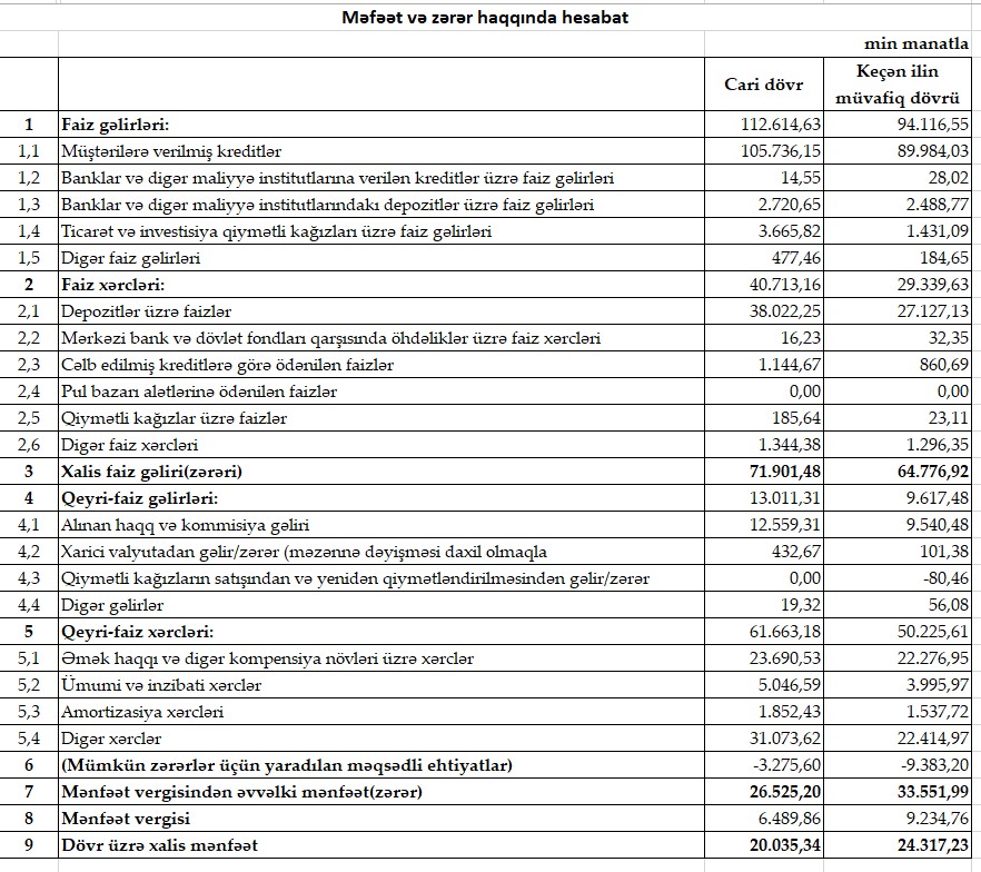 "Bank of Baku" ASC 2024-cü ilin 9 ayını 20 milyon 35 min manat xalis mənfəət ilə başa vurub. Bank 2023-cü ilin eyni dövrünü 24 milyon 317 min manat xalis mənfəət ilə bağlamışdı. Xalis mənfəətdə dəyişiklik, əsasən, mümkün zərərlər üçün yaradılan məqsədli ehtiyatlardan azad olan (qayıdan) məbləğin azalması ilə əlaqədardır. Cari ilin 9 ayında "Bank of Baku" daha da böyüyüb, kredit portfeli və gəlirləri artıb.