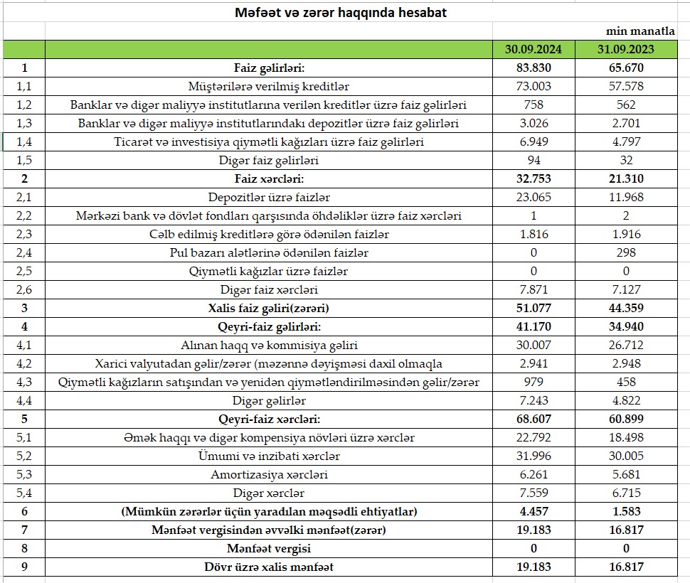 Bankın faiz gəlirləri ötən ilin analoji dövrü ilə müqayisədə 28% artaraq 83 milyon 830 min manata çatıb. Qeyri-faiz gəlirləri isə 18% artımla 41 milyon 170 min manata yüksəlib.