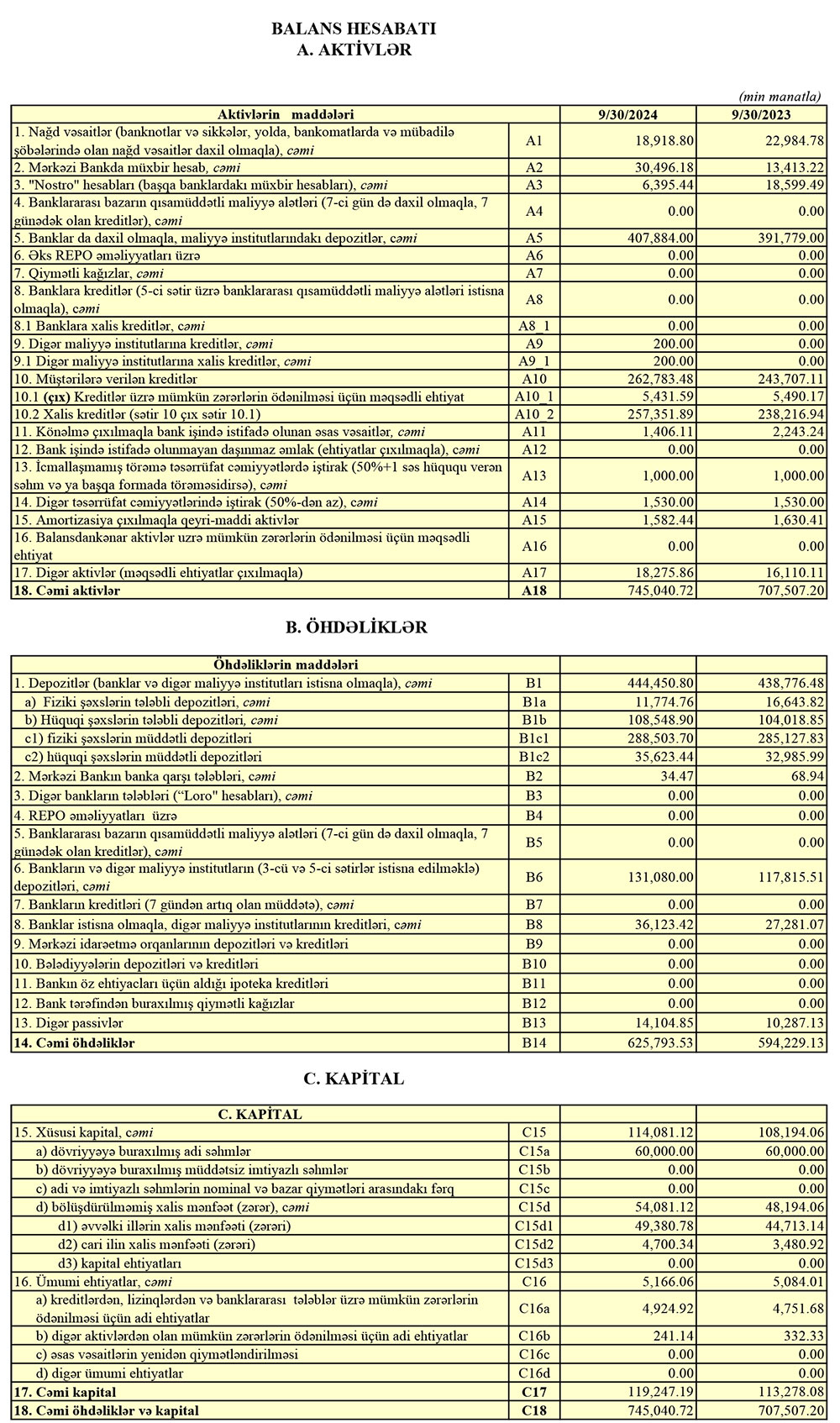 "Azərbaycan Sənaye Bankı" kredit portfeli 30 sentyabr 2023-cü il tarixilə müqayisədə 19 milyon 76 min manat və ya 7,8% artaraq 30 sentyabr 2024-cü il tarixində 262 milyon 783 min manata, banklar da daxil olmaqla, maliyyə institutlarındakı depozitləri 16 milyon 105 min manat və ya 4,1% artaraq 407 milyon 884 min manata çatıb.