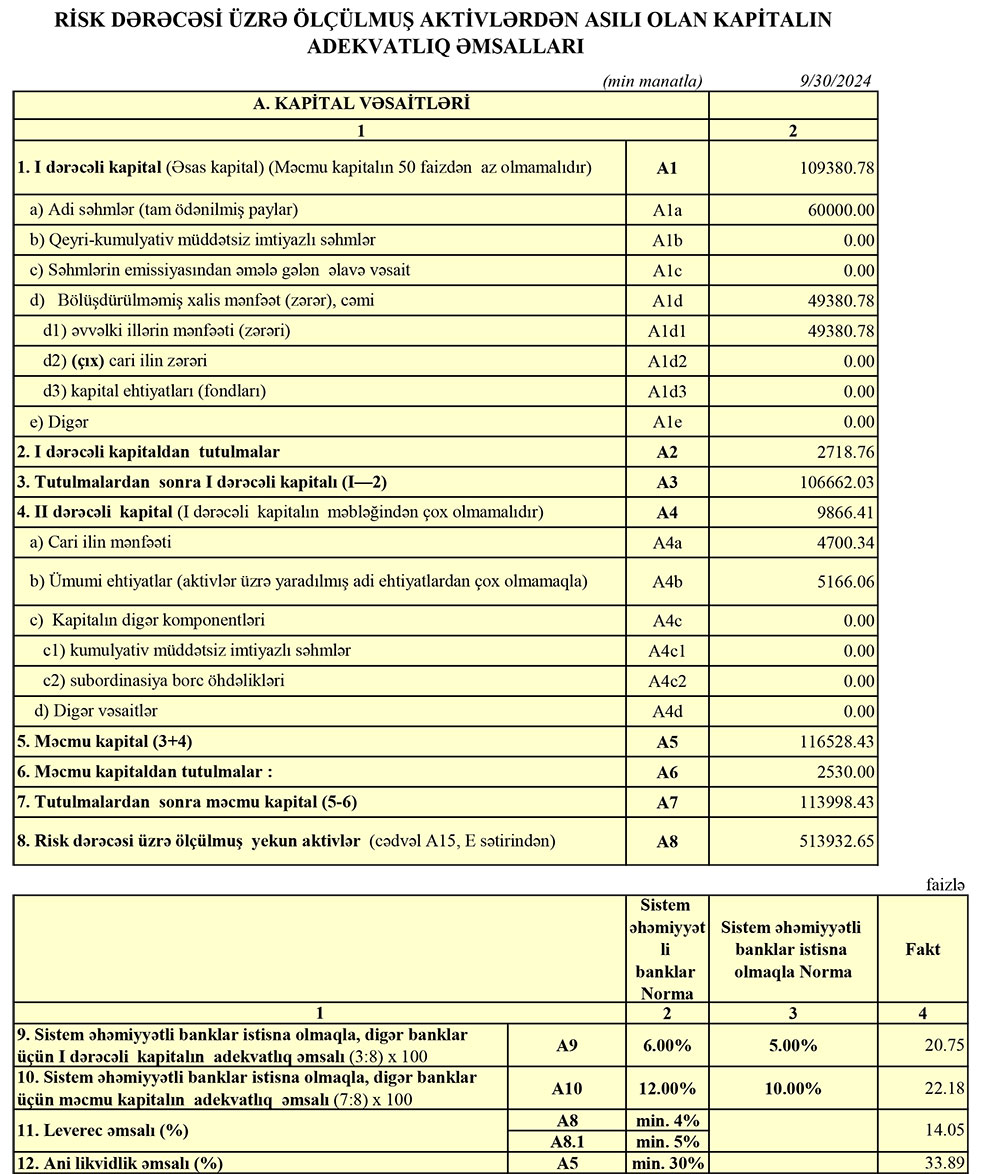 Müqayisə olunan dövrdə Bankın cəmi aktivləri isə 37 milyon 533 min manat və ya 5,3% artaraq 745 milyon 40 min manata çatıb. Bankda cəmi depozitlər isə 5 milyon 674 min manat artaraq 444 milyon 450 min manata yüksəlib.