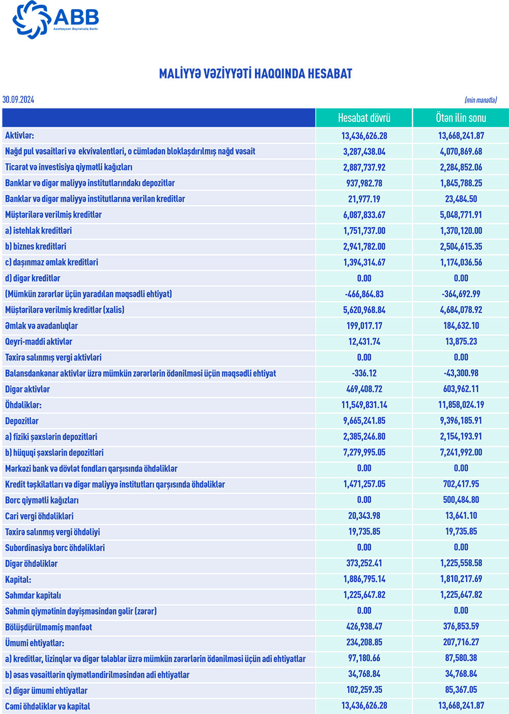 2023-cü ilin sonu ilə müqayisədə 2024-cü ilin 9 ayı (yanvar-sentyabr) ərzində ABB-nin (Azərbaycan Beynəlxalq Bankı) kredit portfeli (müştərilərə verilmiş kreditlər) 1 milyard 39 milyon 62 min manat və ya 20,6% artaraq 30 sentyabr 2024-cü il tarixində 2 milyard 887 milyon 737 min manata çatıb.