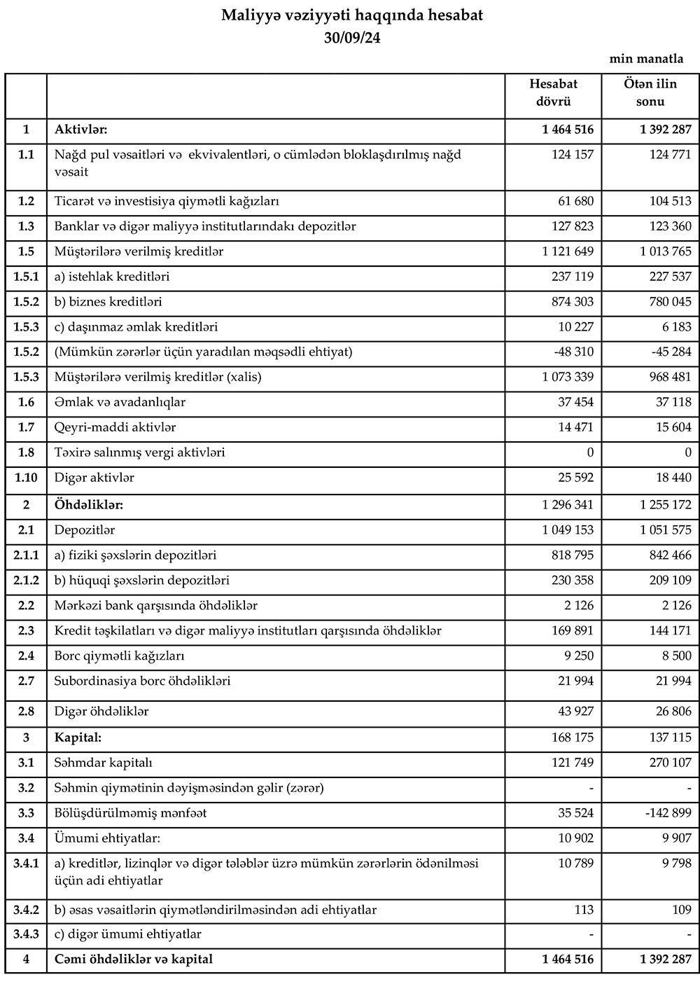O cümlədən, Bankın istehlak kreditləri portfeli 9 milyon 582 min manat artaraq 237 milyon 119 min manata, biznes kreditləri portfeli 94 milyon 258 min manat aratarq 874 milyon 303 min manata, ipoteka kreditləri portfeli 4 milyon 44 min manat artaraq 10 milyon 227 min manata yüsksəlib.