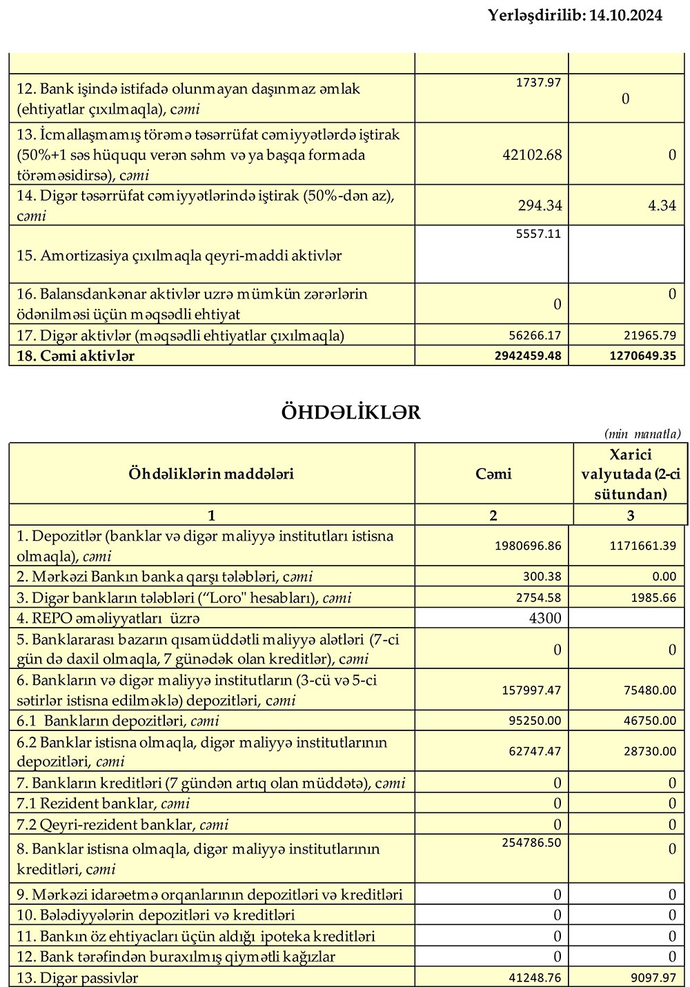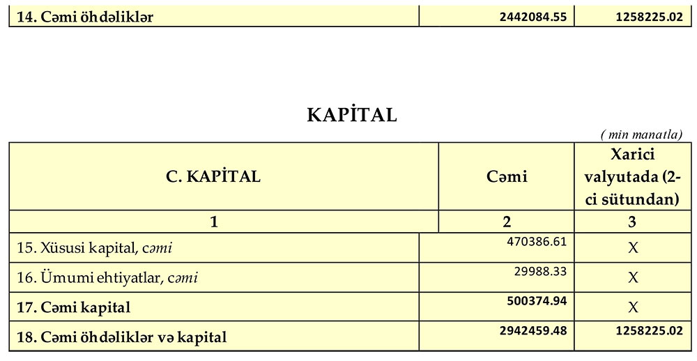2024-cü ilin III rübünün sonuna Bankın “banklar və digər maliyyə institutları istisna olmaqla” depozitlərinin həcmi 1 milyard 981 milyon manat təşkil etmişdir.