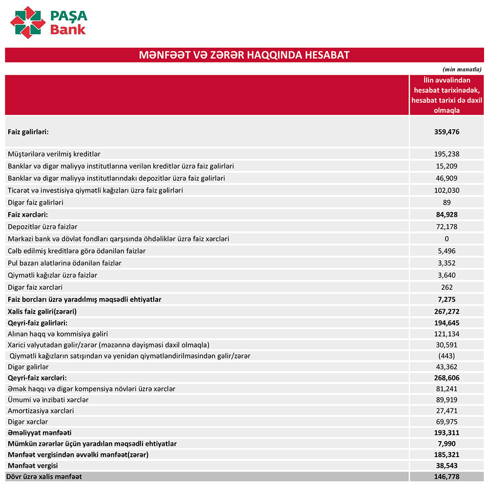 2023-cü ilin sonu ilə müqayisədə 2024-cü ilin 9 ayı ərzində "PAŞA Bankın" cəmi aktivləri 75 milyon 550 min manat azalaraq 8 milyard 575 milyon 821 min manata, Bankda depozitlər isə 75 milyon 7 min manat azalaraq 6 milyard 860 milyon 168 min manata geriləyib. Bankda fiziki şəxslərin depozitləri 281 milyon 802 min manat artıb, hüquqi şəxslərin depozitləri 356 milyon 808 min manat azalıb.