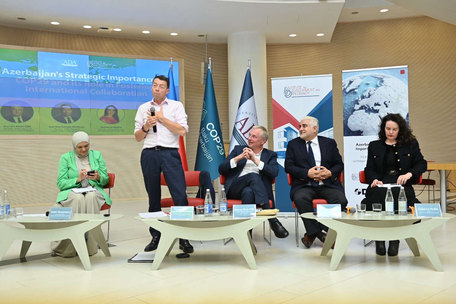 Böyük Britaniya Lordlar Palatasından iki lord - uzun müddət Mühafizəkarlar Partiyasının sədri vəzifəsini icra etmiş Lord Darren Mott və 7 il İşçi Partiyasının Baş Katibi vəzifəsini icra etmiş Lord Iain McNicol ADA Universitetində təşkil edilmiş “Azərbaycanın COP29-da strateji əhəmiyyəti” adlı konfransda çıxış etmək üçün “Qarabağ” Futbol Klubunun Prezidenti, iş adamı Tahir Gözelin qonağı olaraq Bakıya səfər ediblər.