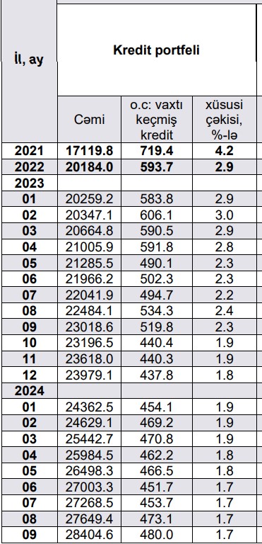 2024-cü ilin 9 ayında kredit təşkilatlarının (bank və BOKT) cəmi kredit portfelində ödəmə vaxtı keçmiş kreditlərin məbləği 42,2 milyon manat artaraq 30 sentyabr 2024-cü il tarixində 480 milyon manat təşkil edib.