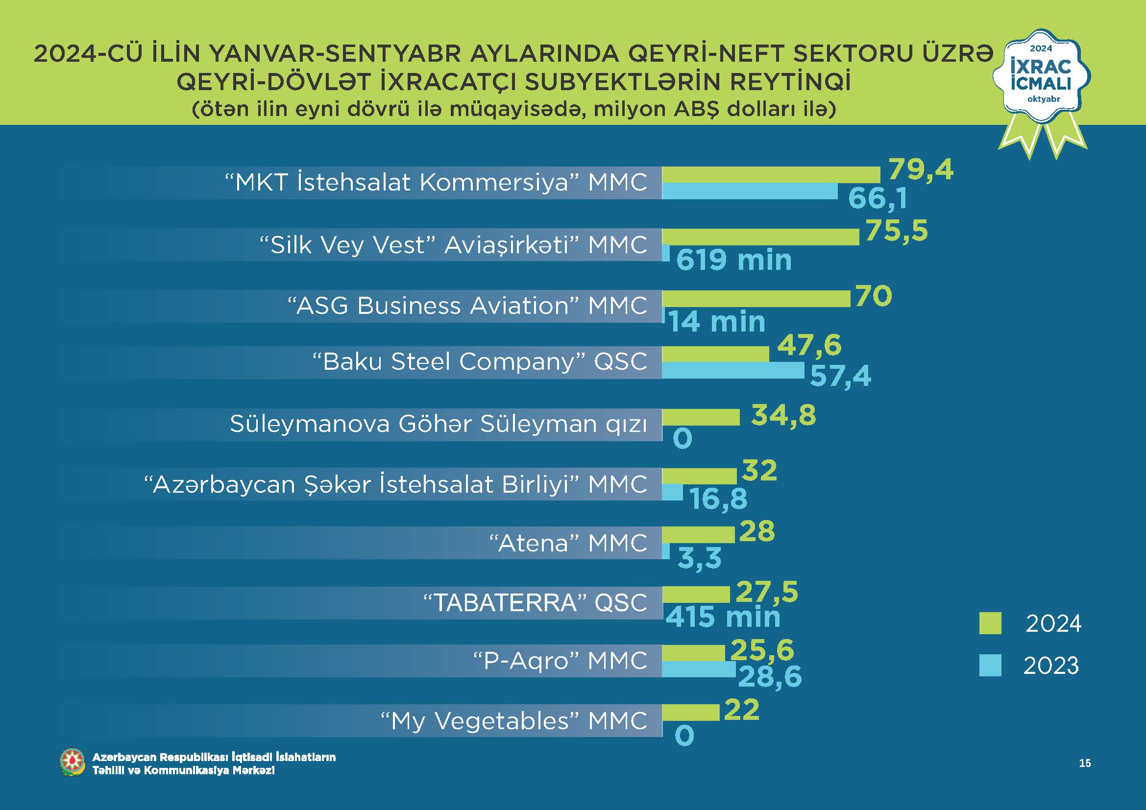 Marja.az icmala əsasən xəbər verir ki, 2024-cü ilin yanvar-sentyabr ayları üzrə hazırlanmış qeyri-dövlət ixracatçı subyektlərin reytinqində ilk onluqda aşağıdakı şirkətlər təmsil olunublar: