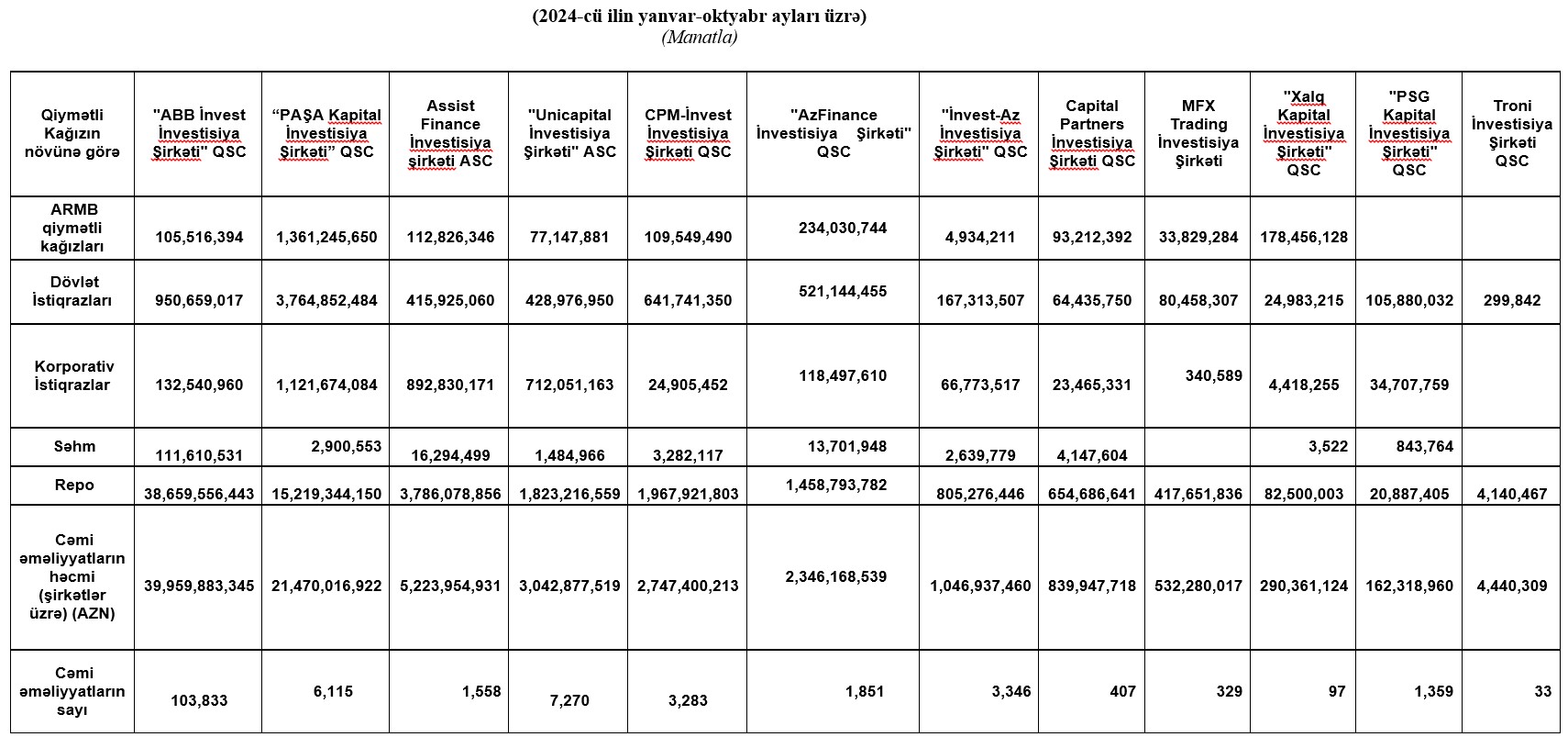 Marja.az xəbər verir ki, 2024-cü ilin yanvar-oktyabr ayları üzrə, "ABB İnvest İnvestisiya Şirkəti" QSC 39 milyard 959 milyon 883 min ,345 manat dövriyyə ilə 1-ci, “PAŞA Kapital İnvestisiya Şirkəti” QSC 21 milyard 470 milyon 16 min 922 manat dövriyyə ilə 2-ci, "Assist Finance İnvestisiya Şirkəti" ASC 5 milyard 223 milyon 954 min 931 manat dövriyyə ilə 3-cü olub.