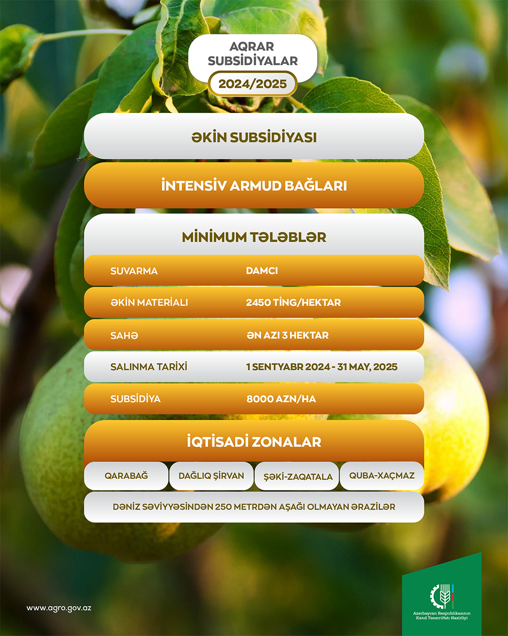 Aqrar Subsidiya Şurasının qərarına əsasən, sentyabrın 1-dən 2025-ci il mayın 31-dək salınan armud bağlarının hər hektarına görə, fermerlərə 8000 manat əkin subsidiyası veriləcək.