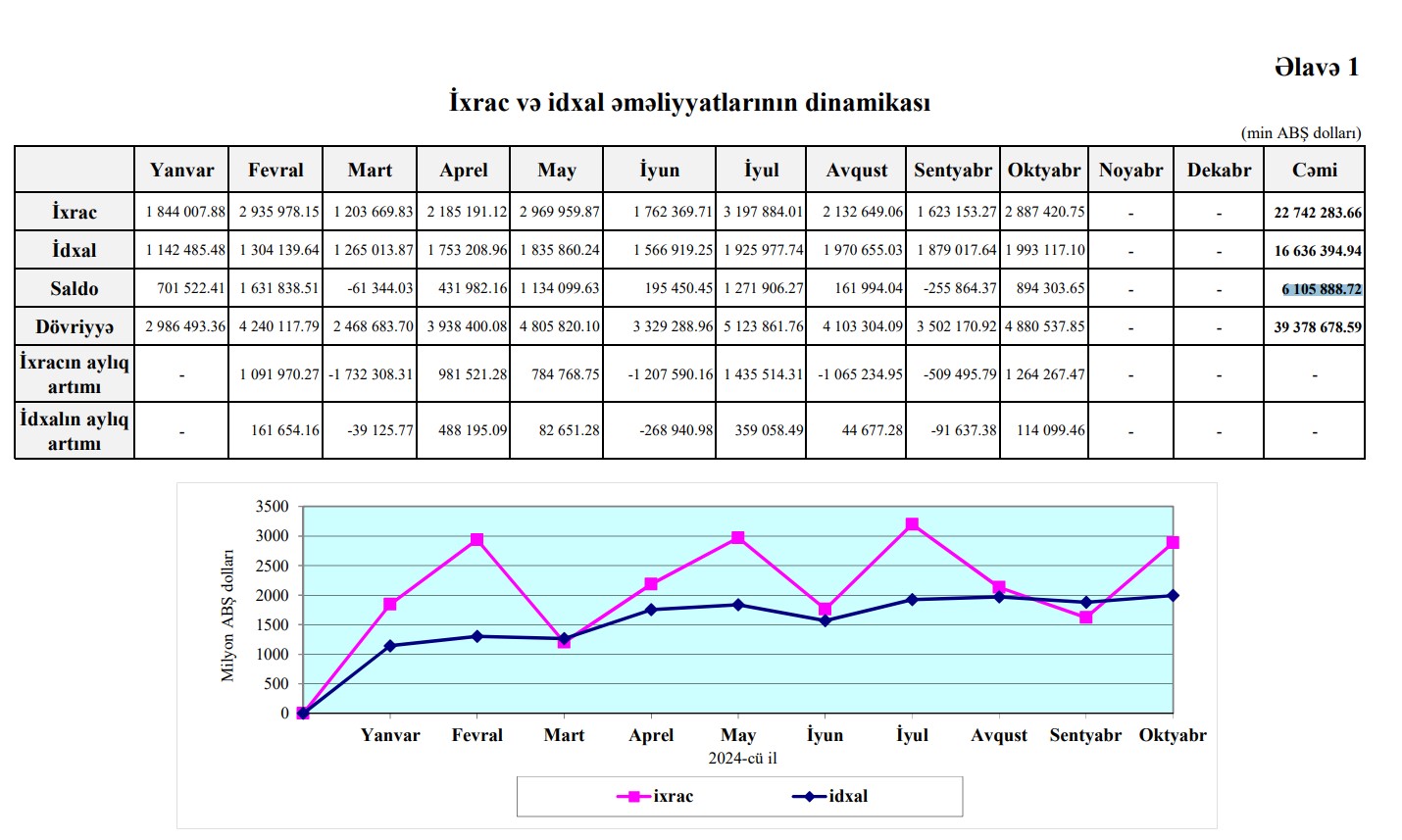 Müqayisə üçün qeyd edək ki, 2023-cü ilin 10 ayı ərzində Azərbaycanın xarici ticarət əməliyyatlarının həcmi43 milyard 520 milyon 185 min ABŞ dolları, o cümlədən, ixrac 29 milyard 345 milyon 994 min ABŞ dolları, idxal 14 milyard 174 milyon 191 min ABŞ dolları, saldo müsbət 15 milyard 171 milyon 804 min ABŞ dolları təşkil etmişdi.