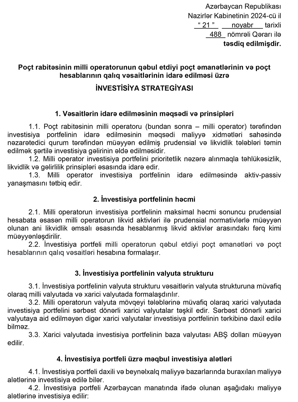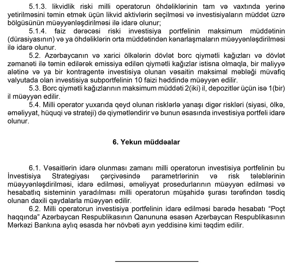 Qəraraə əsasən, poçt rabitəsinin milli operatorunun investisiya portfelini idarə etməsinin məqsədi maliyyə xidmətləri sahəsində nəzarətedici qurumun müəyyən etdiyi prudensial və likvidlik tələbləri təmin edilmək şərtilə investisiya gəlirinin əldə edilməsidir.