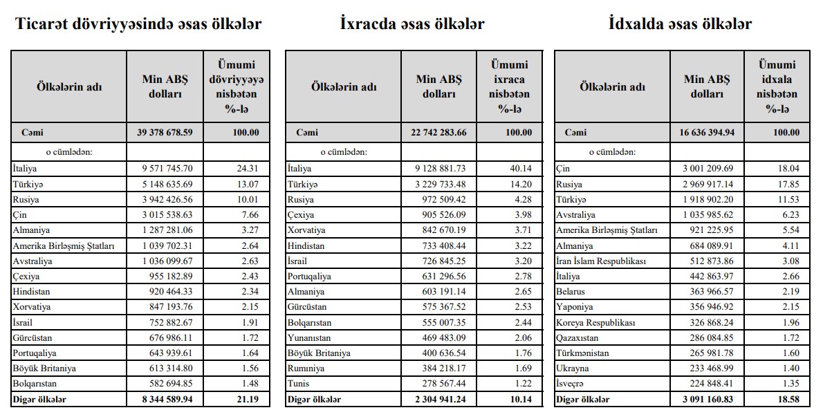 Azərbaycanın idxalında əsas ölkələr siyahısında sürpriz ad
