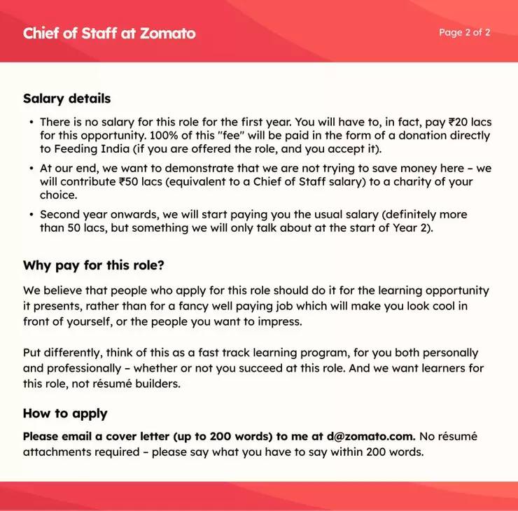 Zomato-nun Baş direktoru öz yazısında ödənişi özünün “Feding India” adlı qeyri-hökumət təşkilatına veriləcəyini bildirib və bu vəzifənin idarəetmənin öyrədildiyi kursdan “10 dəfə daha çox öyrənmə” təmin edəcək “sürətli öyrənmə proqramı” olduğunu bildirib.