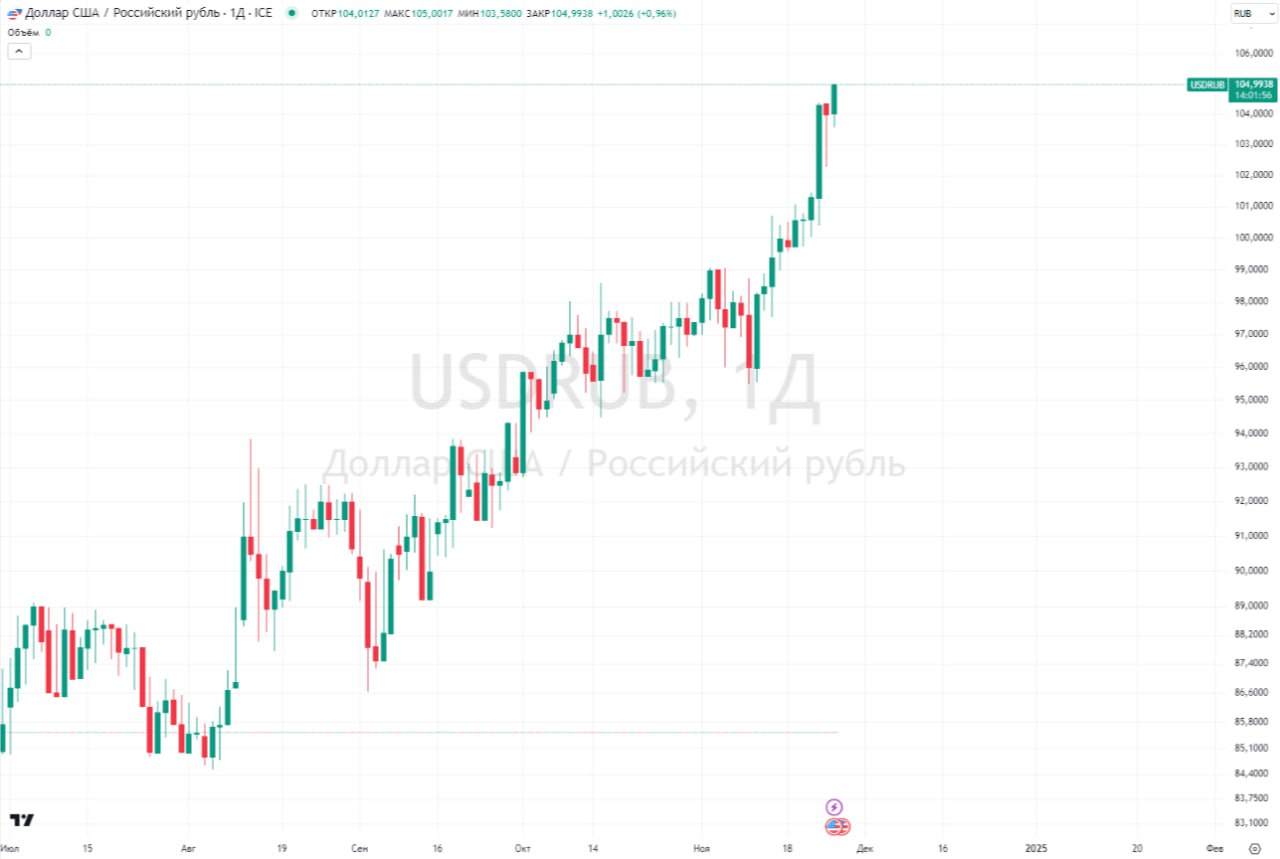 Bakı vaxtı ilə saat 12:00-a olan məlumata görə, Beynəlxalq Forex bazarında dolların məzənnəsi 105 rublu ötüb