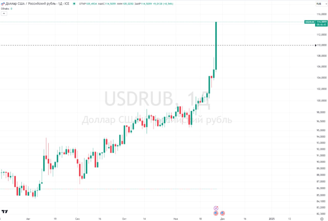 Rusiyanın banklararası bazarında dolların məzənnəsi 114,506 rubl (+7,1%) təşkil edib. Rusiya Mərkəzi Bankının noyabrın 27-nə olan Dolların rəsmi məzənnəsi 105,0604 rubldur.
