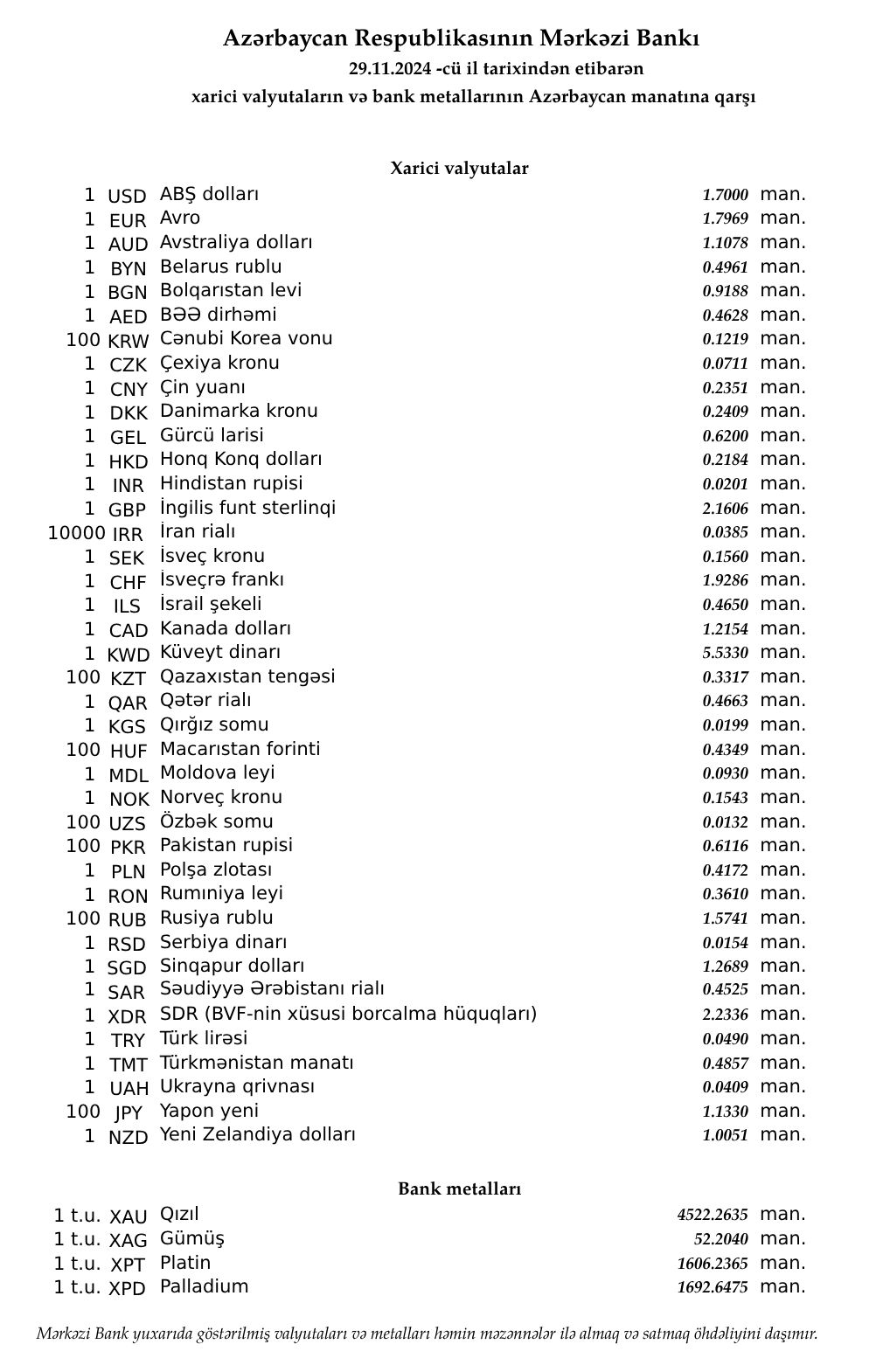 Rəsmi məzənnələr açıqlandı