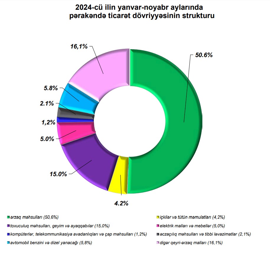 2024-cü ilin yanvar-noyabr aylarında alıcıların pərakəndə ticarət şəbəkəsində aldıqları mallara xərclədiyi vəsaitin 50,6 faizi ərzaq məhsullarının, 4,2 faizi içkilər və tütün məmulatlarının, 15,0 faizi toxuculuq məhsulları, geyim və ayaqqabıların, 5,8 faizi avtomobil benzini və dizel yanacağının, 5,0 faizi elektrik malları və mebellərin, 2,1 faizi əczaçılıq məhsulları və tibbi ləvazimatların, 1,2 faizi kompüterlər, telekommunikasiya avadanlıqları və çap məhsullarının, 16,1 faizi isə digər qeyri-ərzaq mallarının alınmasına sərf olunmuşdur.