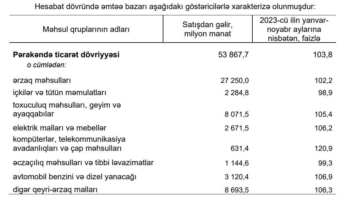 2024-cü ilin yanvar-noyabr aylarında pərakəndə ticarət şəbəkəsində istehlakçılara 53 milyard 867,7 milyon manatlıq, o cümlədən 29 milyard 534,8 milyon manatlıq ərzaq məhsulları, içkilər və tütün məmulatları, 24 milyard 332,9 milyon manatlıq qeyri-ərzaq malları satılmışdır.