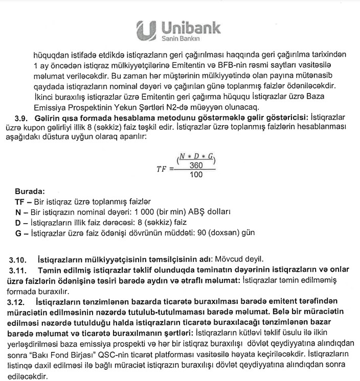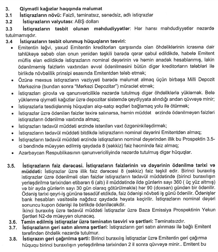 Marja.az xəbər verir ki, Bank hər birinin nominal dəyəri 1000 ABŞ dolları olan 15 000 ədəd faizli, sənədsiz, adlı, təmin edilməmiş istiqraz buraxır.
