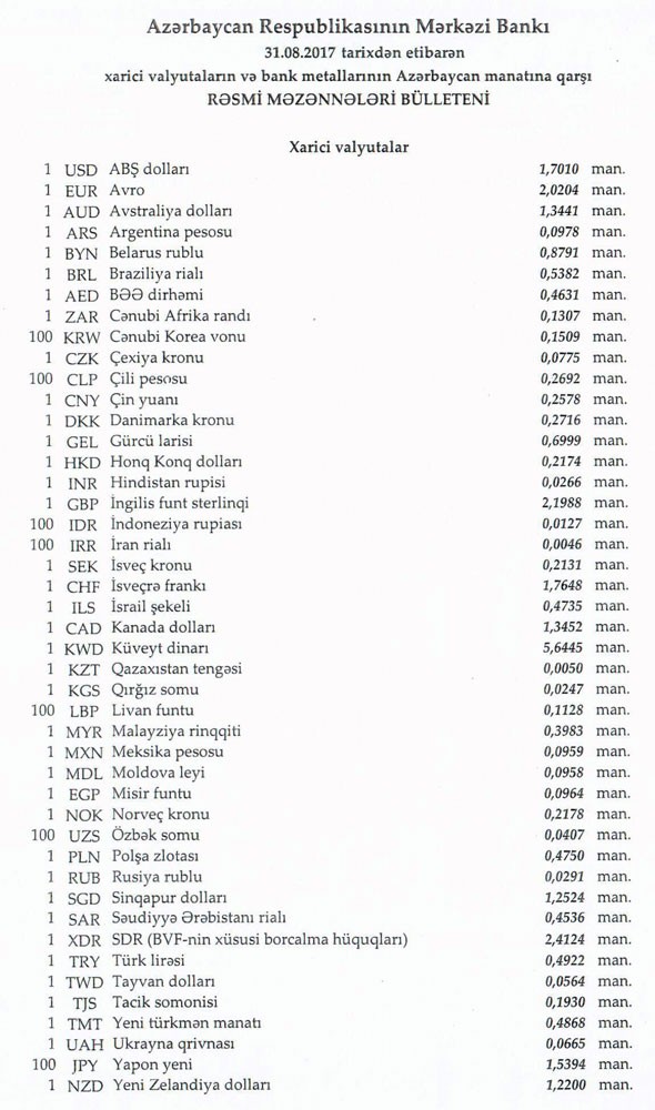 Avqustun 30-da rəsmi olaraq 1 dollar 1,7010 manata, 1 avro isə 2.0367 manata bərabər idi.
