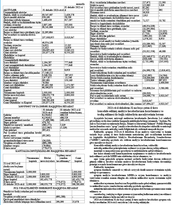“Ağdam, Füzuli və Xocavənd rayonlarında Bərpa, Tikinti və İdarəetmə Xidməti” Publik Hüquqi Şəxsin 2023-cü il dekabrın 31-nə konsolidə edilmiş maliyyə vəziyyəti haqqında hesabatı dərc olunub.