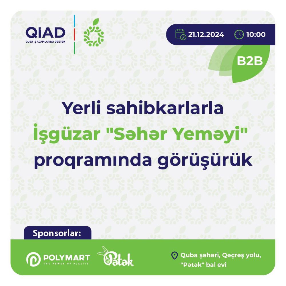 Quba İş Adamlarına Dəstək (QİAD) platformasının təşkilatçılığı, "Pətək" bal evi və "Polymart" şirkətinin sponsorluğu ilə Qubada sahibkarlar "Səhər Yeməyi" proqramında bir araya gəliblər.