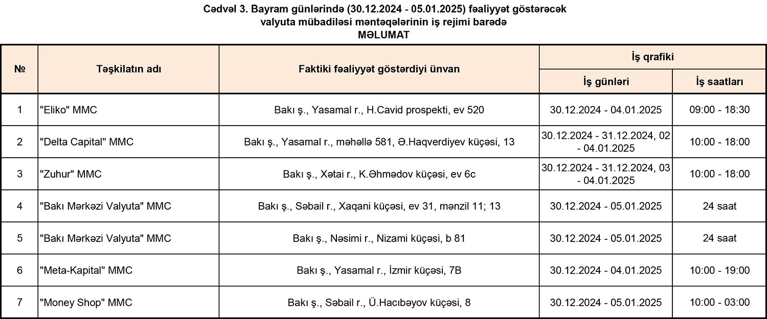 Mərkəzi Bankın yaydığı məlumatda bildirilir ki, Bayram günlərində ölkəmizdə səfərdə olan turistlərin və ölkə vətəndaşlarının valyuta mübadiləsi xidmətlərinə davamlı çıxış imkanlarının təmin edilməsi məqsədilə ümumilikdə 13 bankın 97 satış nöqtəsi (o cümlədən, 3 bank üzrə 8 satış nöqtəsi 24 saat rejimində olmaqla), “Azərpoçt” MMC-nin 68 şöbəsi, valyuta mübadiləsinə lisenziya almış 7 valyuta mübadiləsi məntəqəsi (o cümlədən, 2-i 24 saat rejimində olmaqla) müştərilərə xidmət göstərəcək.
