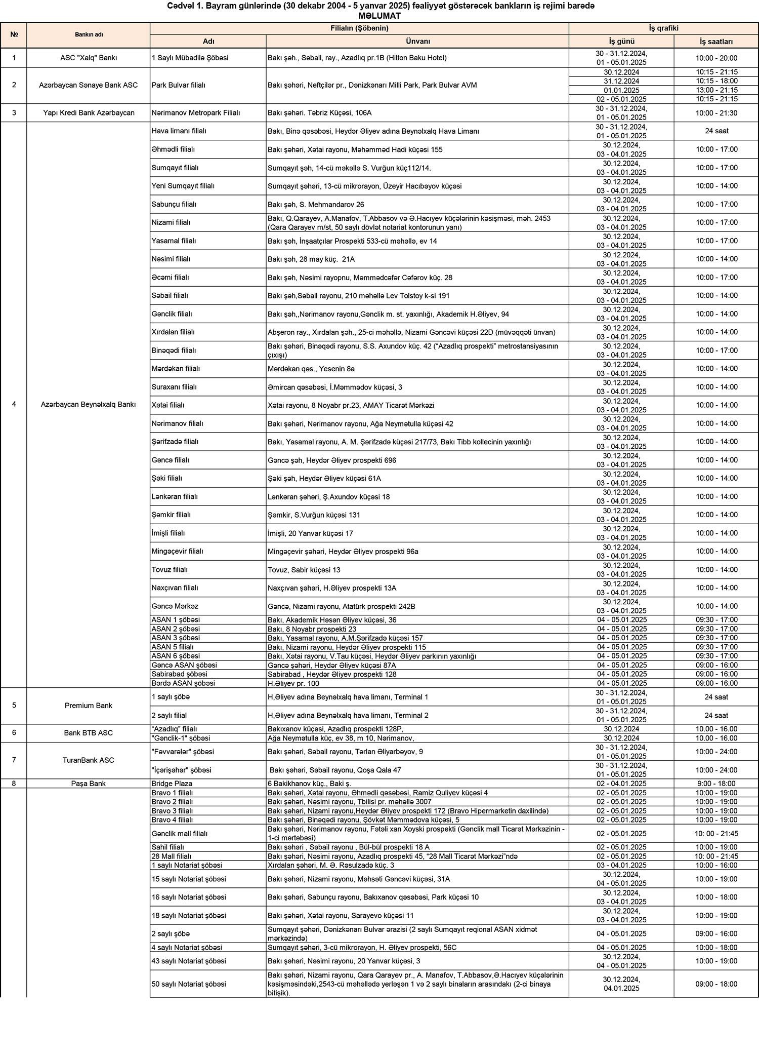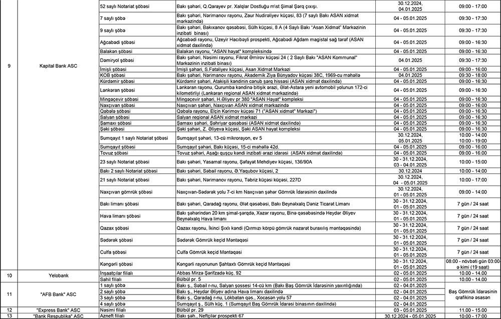 Mərkəzi Bank bayram günlərində (30 dekabr 2004 - 5 yanvar 2025) fəaliyyət göstərəcək bankların iş rejimi barədə məlumat yayıb.5 yanvar 2025–ci tarixləri olan qeyri-iş günlərində bankların və “Azərpoçt” MMC-nin bəzi filial və şöbələri, habelə valyuta mübadilə məntəqələri fəaliyyət göstərəcəklər.