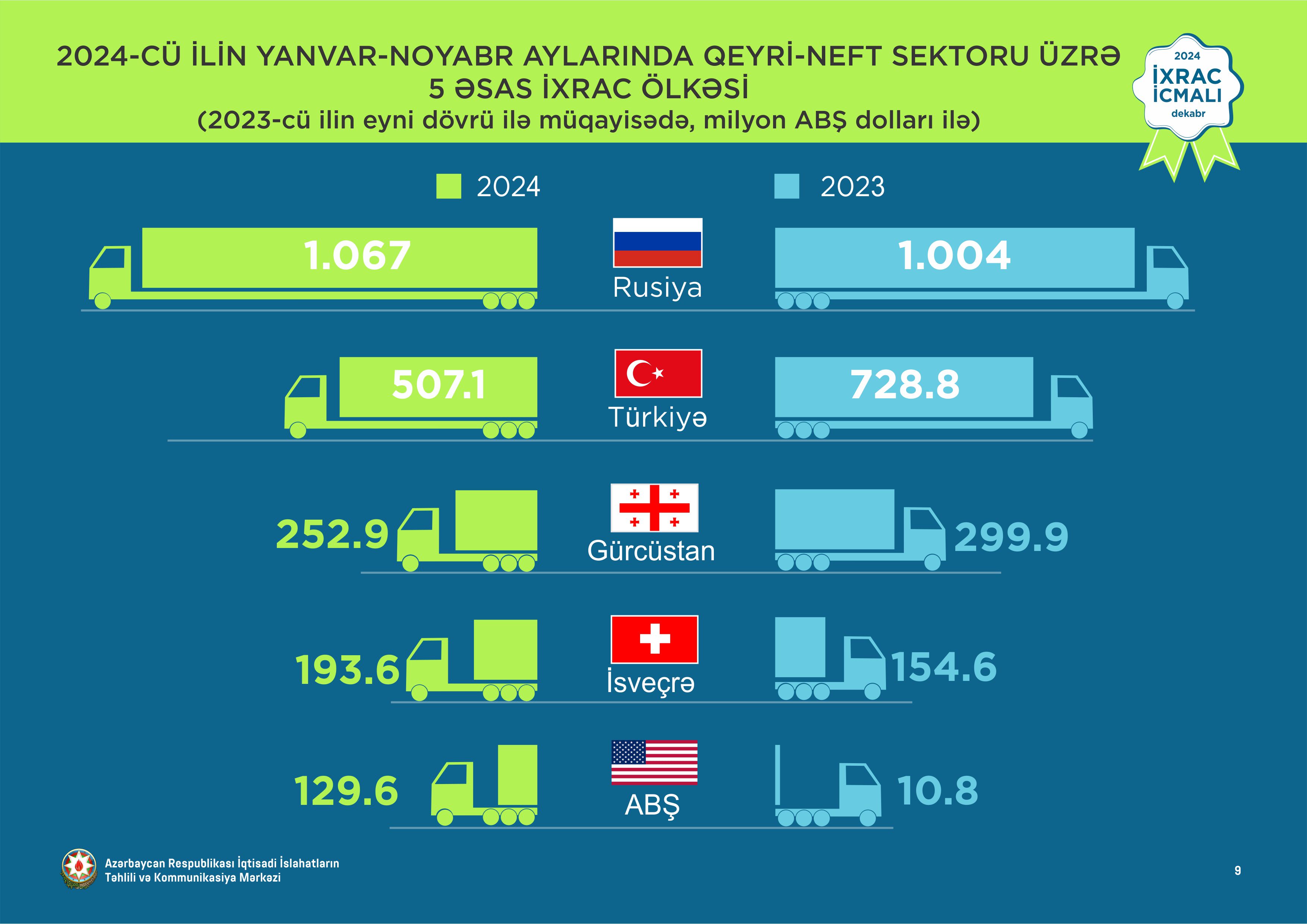 Cari ilin noyabr ayında qeyri-neft sektoruna aid ən çox mal ixrac edilən ölkələrin siyahısında Rusiya Federasiyası (111,2 milyon ABŞ dolları) birinciliyə yüksəlib. Bu siyahıda Türkiyə (30,1 milyon ABŞ dolları) ikinci, İsveçrə (24,7 milyon ABŞ dolları) üçüncü olub.