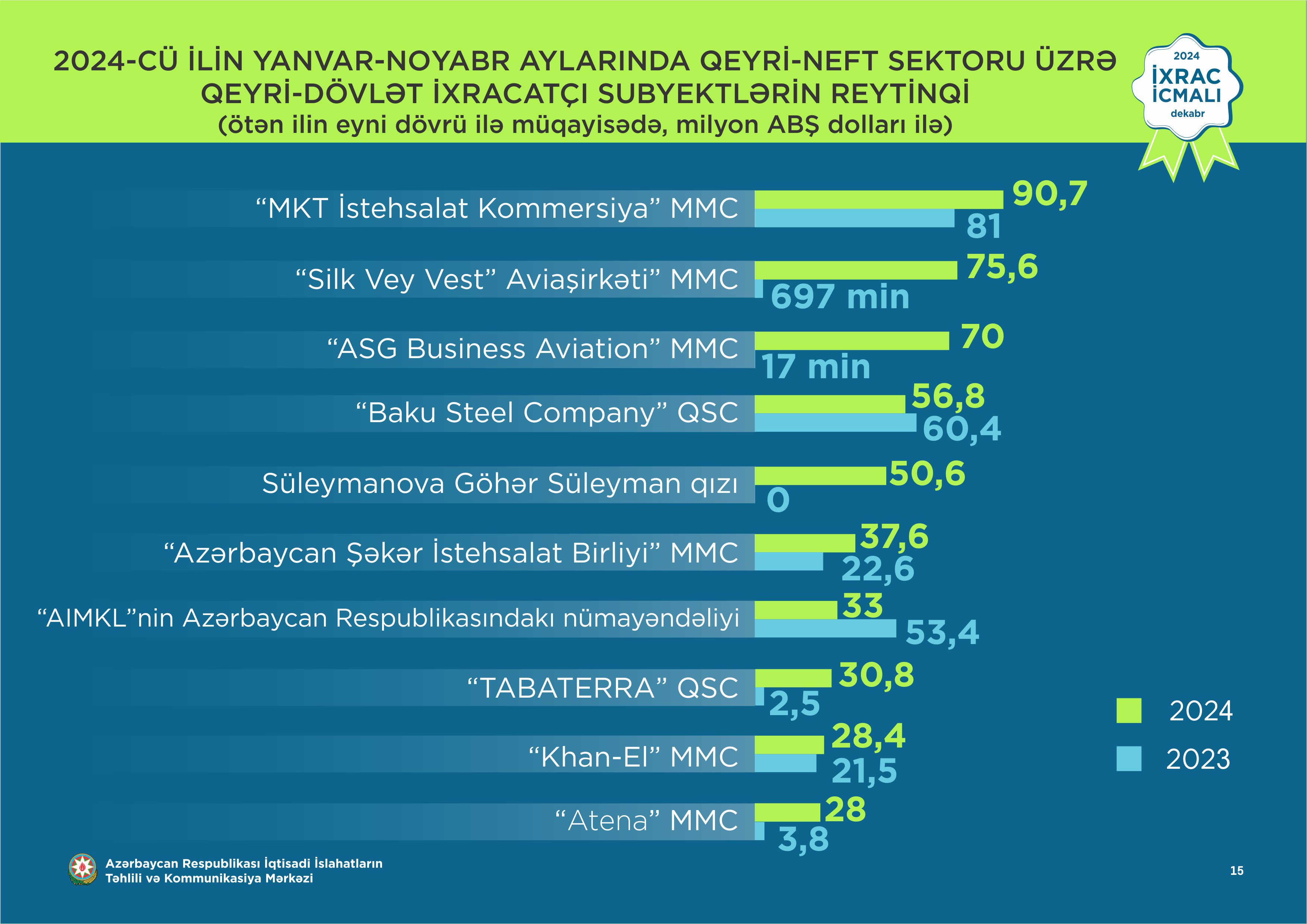 Marja.az İqtisadi İslahatların Təhlili və Kommunikasiya Mərkəzi (İİTKM) “İxrac icmalı”nın dekabr sayına istinadən xəbər verir ki, Göhər Süleymanova 50,6 milyon dollarlıq ixrac həcmilə qeyri-dövlət ixracatçı subyektlərin reytinqində ilk onluqda 5-ci yeri tutub.
