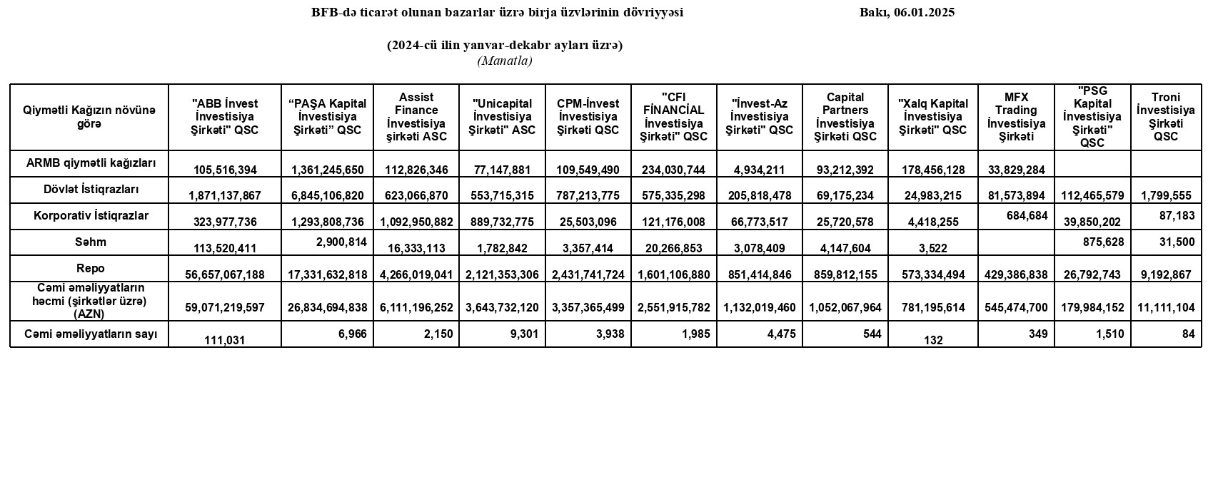 Marja.az Birja-ya istinadən xəbər verir ki, 2024-cü ildə "ABB İnvest İnvestisiya Şirkəti" QSC 59 milyard 71 milyon 220 min manatlıq dövriyyə ilə 1-ci, "PAŞA Kapital İnvestisiya Şirkəti” QSC 26 milyard 834 milyon 695 min manatlıq dövriyyə ilə 2-ci və "Assist Finance İnvestisiya Şirkəti" ASC 6 milyard 111 milyon 196 min manatlıq dövriyyə dövriyyə ilə 3-cü yeri tutub.