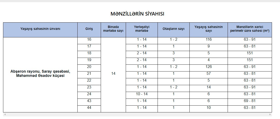 Yeni mənzillər seçim üçün 21 yanvar 2025-ci ildən etibarən açıq olacaq. Vətəndaşlar təqdim olunan yaşayış sahələrinin siyahısı ilə aşağıdakı cədvəldə tanış ola bilərlər.